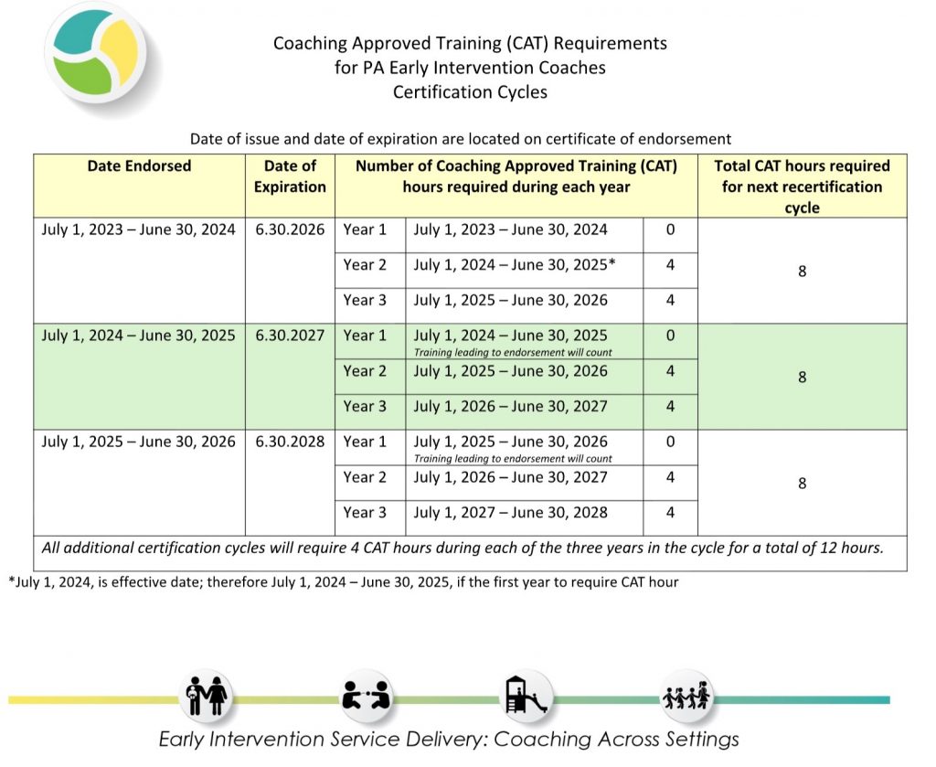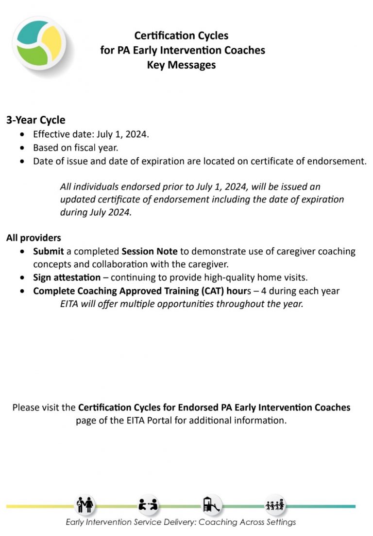 The Certification Cycle has been developed to ensure continued implementation of the state identified practices which align with the Pennsylvania Principles of Early Intervention. The process is designed to be manageable and is consistent with other professional licensing and certification processes.