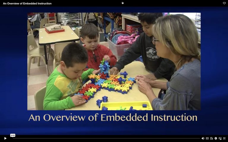 In embedded instruction, teachers, families, and other caregivers learn how to provide developmentally appropriate, intentional instruction to advance children’s engagement and learning as part of their everyday activities, routines, and transitions.