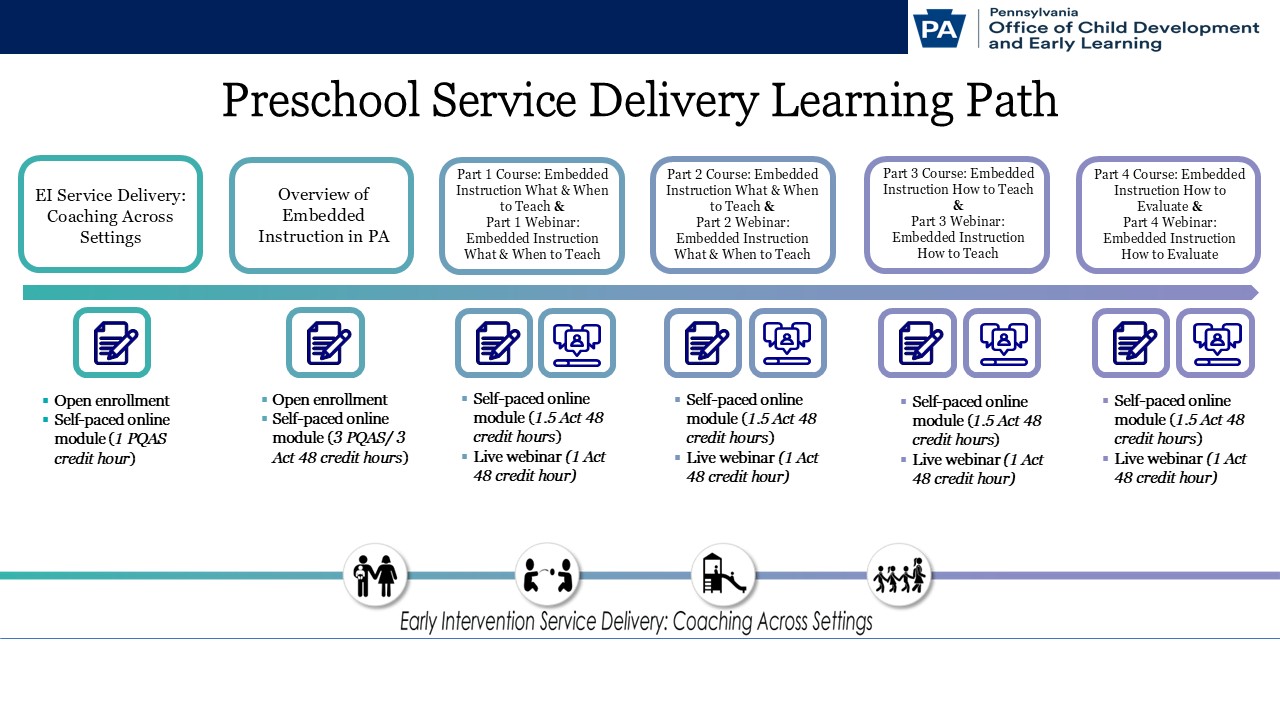 To begin your journey on the Preschool Service Delivery Learning Path, you will need to be selected by your program’s Core Leadership Team and complete the two prerequisite courses: “Early Intervention Service Delivery: Coaching Across Settings” and “An Overview of Embedded Instruction for Early Learning in Pennsylvania.”