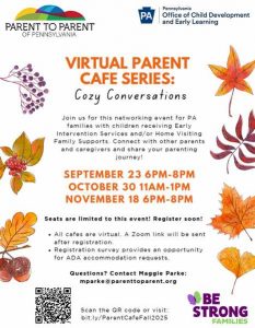 The information on this page is geared to help families connect with other families and get more involved in shaping Early Intervention services at the local and statewide levels. Also included are some key resources that may be of interest to you as you support your child’s learning and development and begin to navigate and understand the Early Intervention and Early Childhood programs in Pennsylvania. Lastly, links to some of the important forms that are used in Early Intervention are included on these pages.